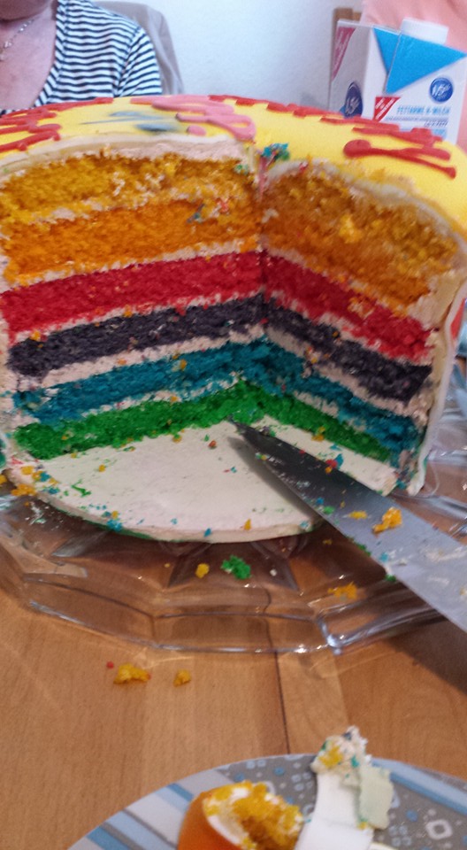 Ich habe für die Regenbogentorte den teig auf 2 gleiche Teile aufgeteilt und in den passenden Farben eingefärbt. Gebacken hatte ich diese aber dann in 20cm Formen. Das hat wirklich super geklappt.